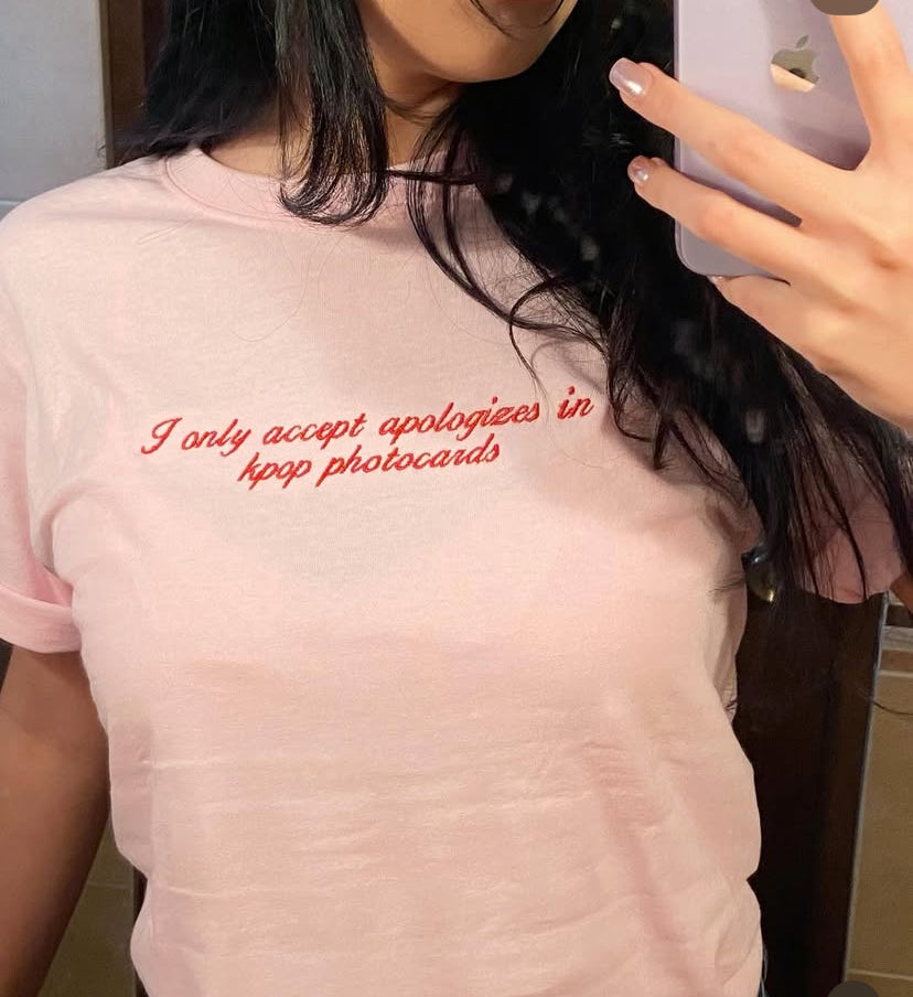 Camisa rosa "I only accept apologizes in kpop photocards"